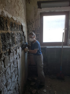 Einen Stemmhammer in der Hand, Mundschutz auf und los geht es. Die kompletten Wände vom Putz befreien, um es vor dem Schimmel zu bewahren. Etwa 70 Helfende waren in einem Haus. Kein eingearbeitetes Team mit großer Erfahrung. Und doch kam es mir vor wie auf einem Ameisenhaufen, wo jeder genau seine Aufgabe hat und alle zusammen helfen. Mit dem einen Ziel vor Augen: dieses Haus retten. Und dieses eine Haus ist nicht nur eine Baustelle, es ist das Zuhause einer Familie. Mit Erinnerungen, Geschichten und einem großen Wert. Mit jedem Eimer voll Bauschutt, der nach draußen gebracht wurde, kamen wir dem Ziel näher.